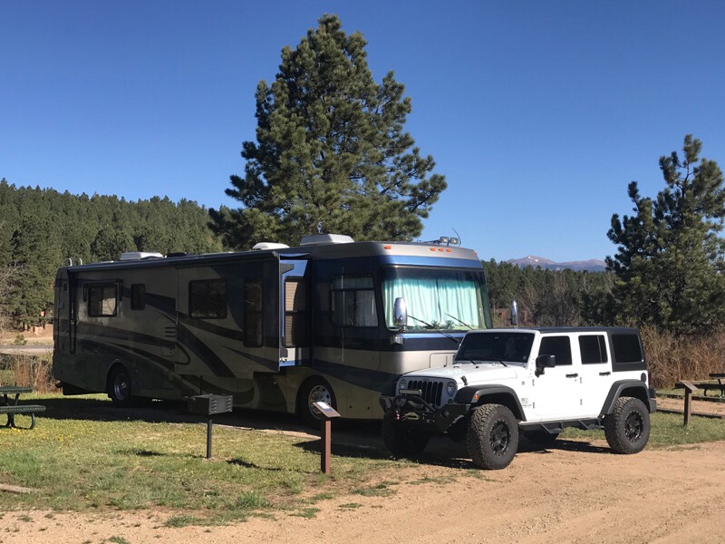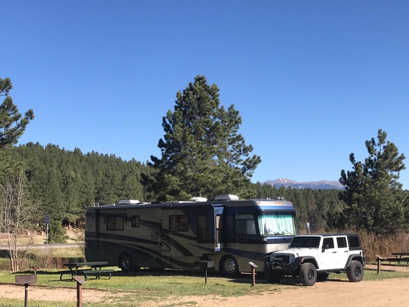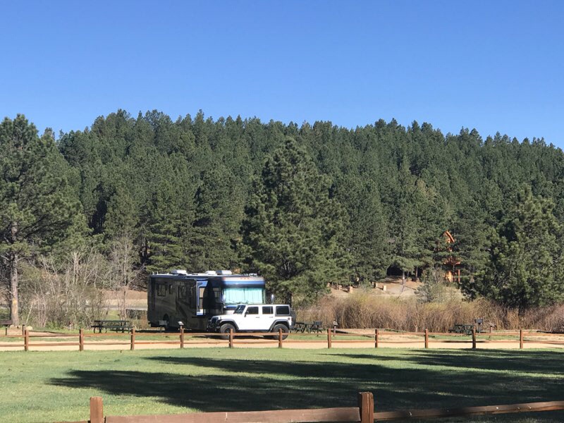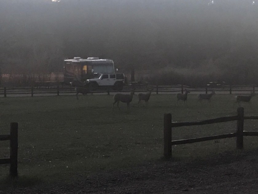 This little jewel of a campground is amazing. So peaceful and we went walking last night and saw about 8-10 mule deer. As we walked, they would walk to another side of the campground. Then when we made it to that side, they would go back to the other side. I also looked outside at 3 am this morning and there was an elk outside my window. Well, I told Jeff it was huge and looked like a horse. He said it was an elk. We are having the trip of a lifetime and it’s just getting started. Once we get set up I’m Ouray we will do more posts about the big blue bus and how we organize and live day to day since some people wonder how we live in a smaller place.