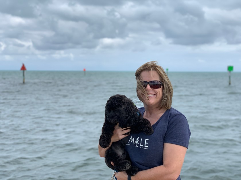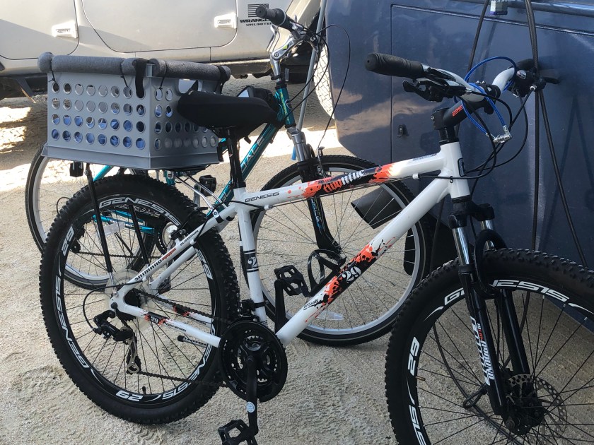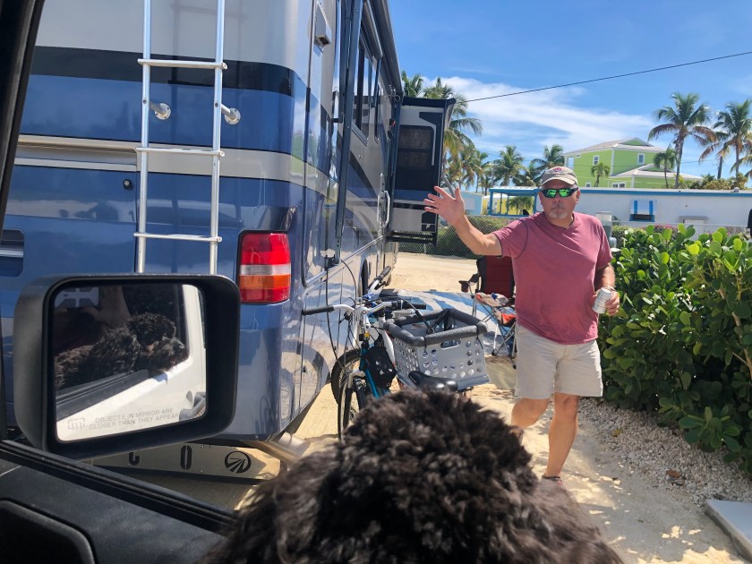 We are in a little campground on mile marker 96 called Key Ventures @96.  Great little spot on the water. We gladly left some cooler weather in North Florida and headed out on Sunday, 2/10. We stopped in Homosassa Springs for two nights and then Koreshan State Park in Estero for one night before we made it to this little park. Yesterday we settled in and got Jeff’s bike ready for Scooter. You can see the picture of the classy carrier we have for him.