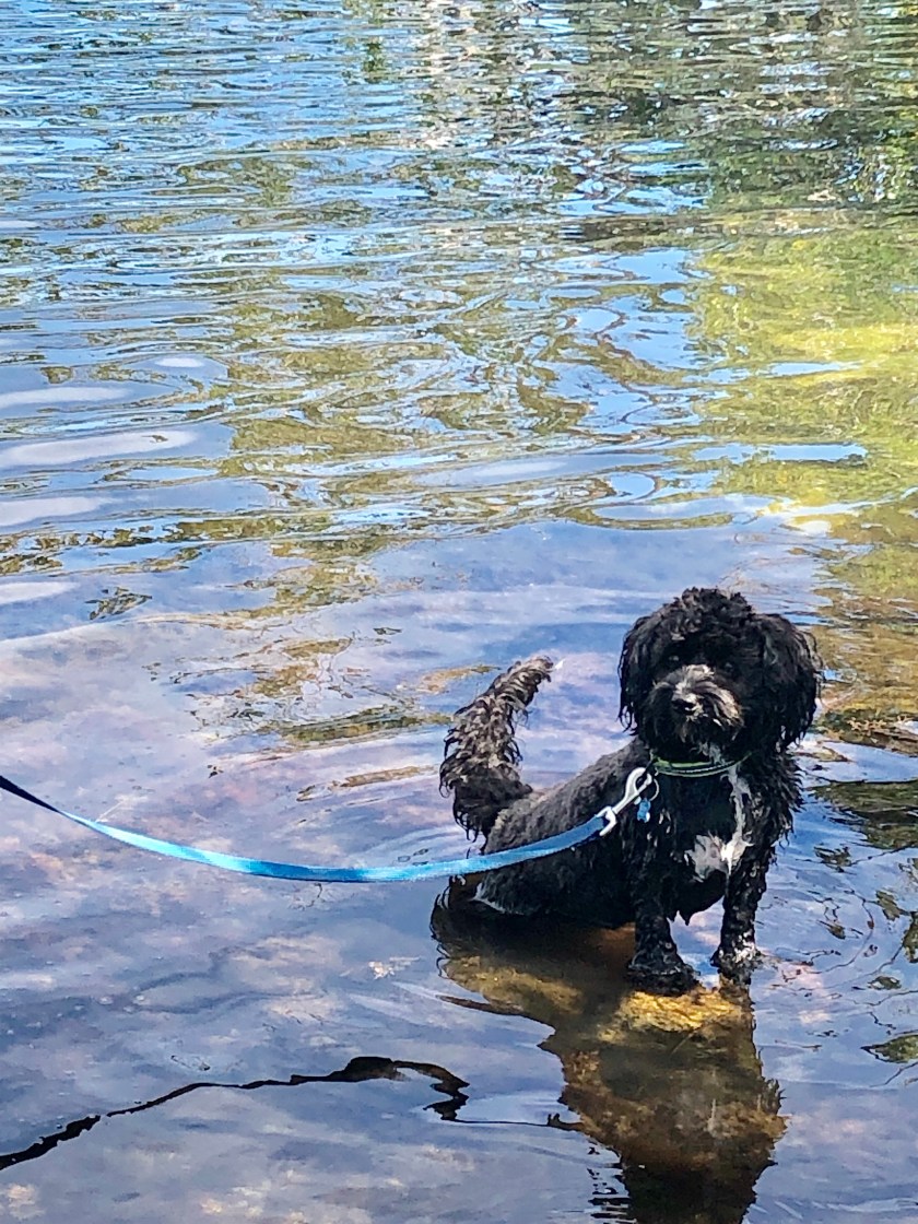 Does Scooter stay in the little basket on the bike? Love that he rides with you! Looks like a fun, relaxing trip!