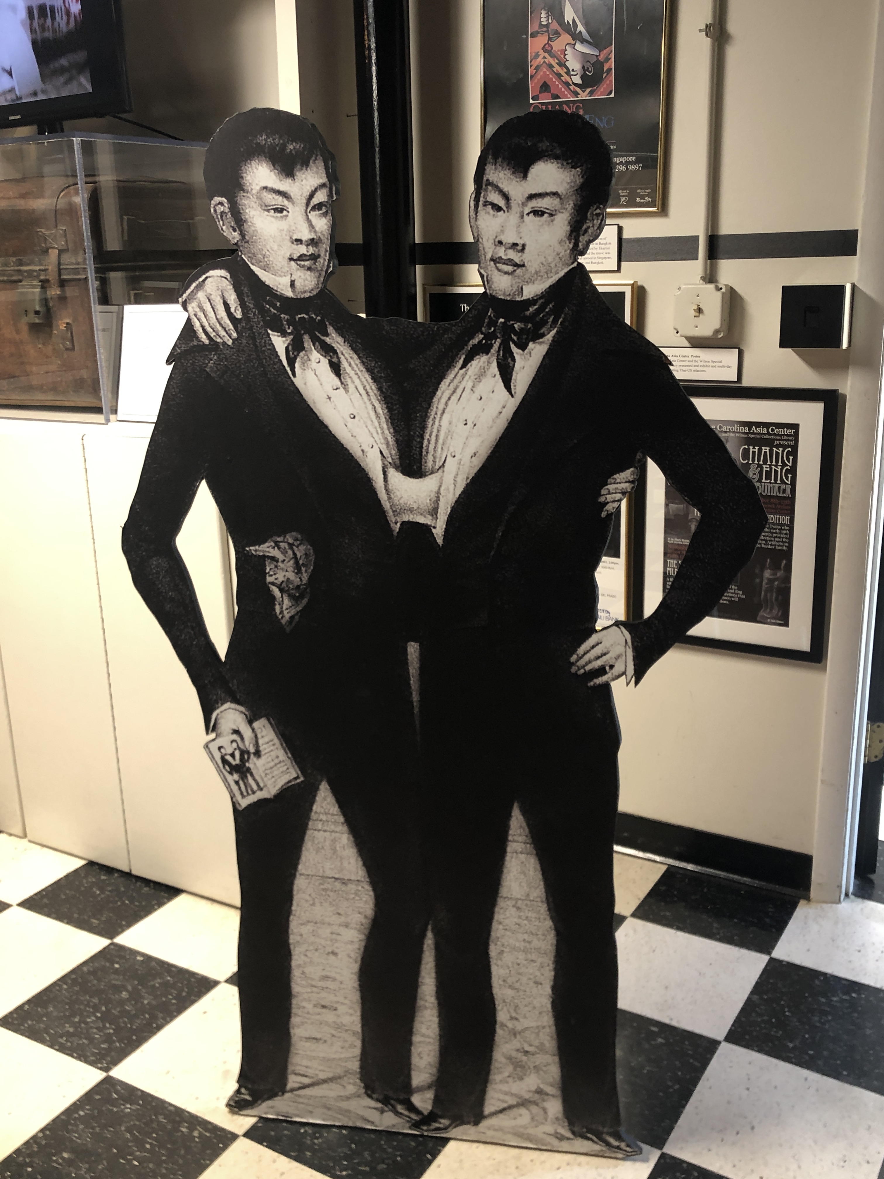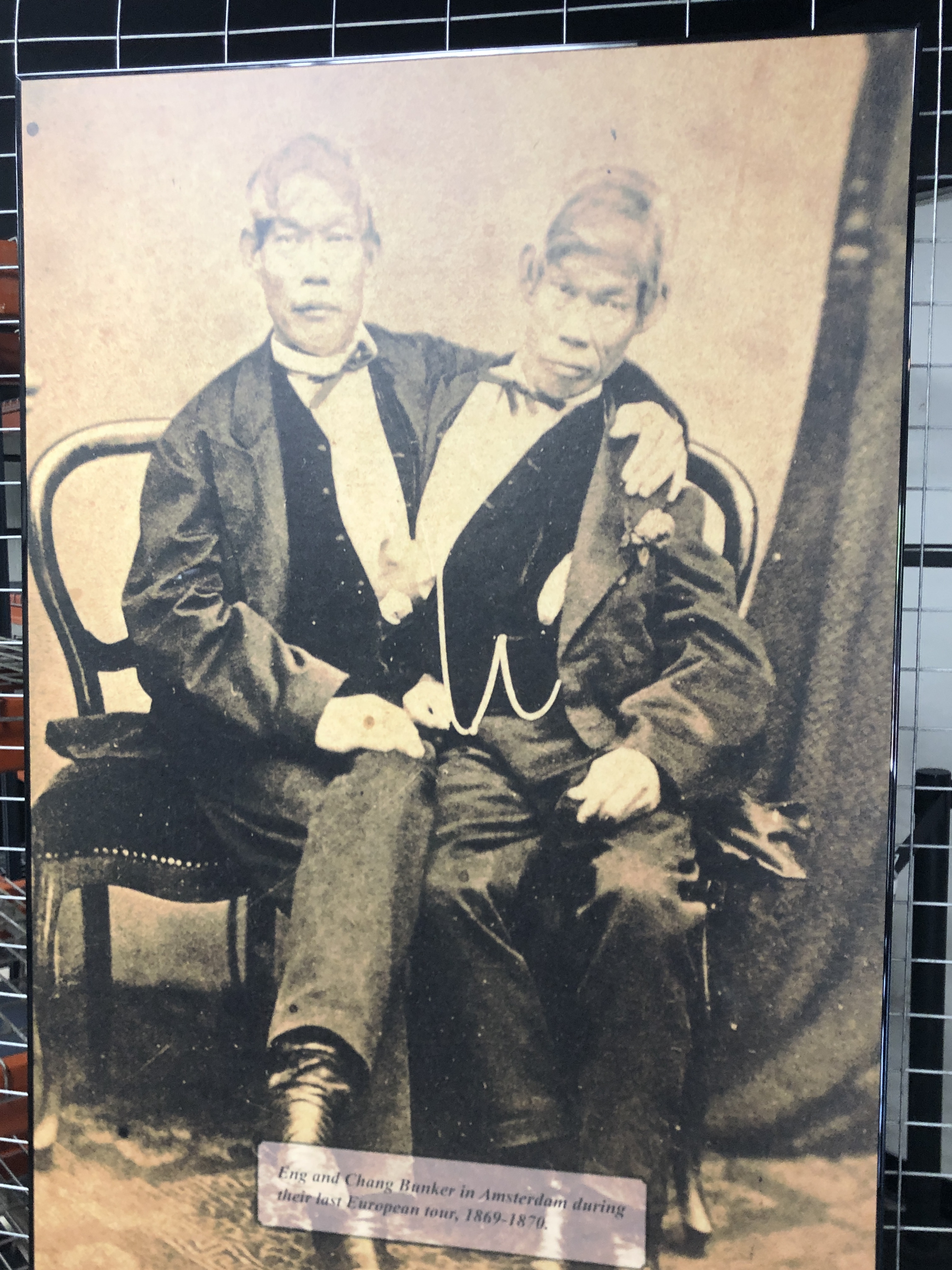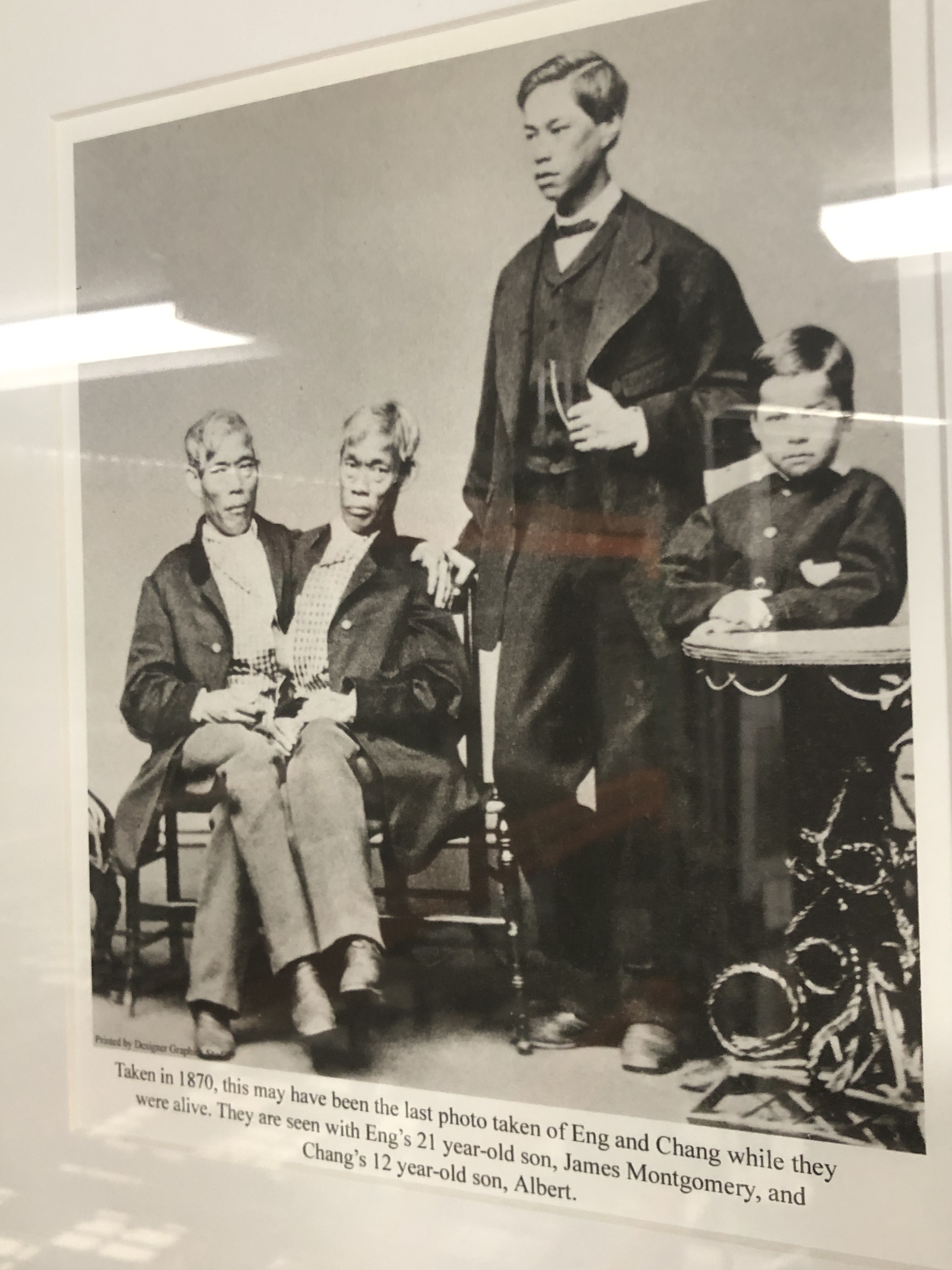 We saw all of the signs named “Eng and Chang”. There’s a Memorial Bridge, there are also streets named Eng and Chang and other memorabilia around town. I looked up the name “Eng and Chang Bunker” and realized that they are the original conjoined twins, and this was the origination for the term “Siamese Twins”. The very same day I looked them up, I was talking to my friend Teresa Nauman and out of the blue she mentioned a podcast that she and her husband had listened to about the twins and Mount Airy. It’s a a Mobituaries podcast titled “Change and Eng: A Messy American Dream”. So we listened to it and became enlightened at the history that’s here in Mount Airy. I’ve taken some information from Wikipedia, ncpedia and the podcast below. In the bottom of the Andy Griffith Museum there’s a portion dedicated to Eng and Chang. I will say that they are highly celebrated in Thailand still today.