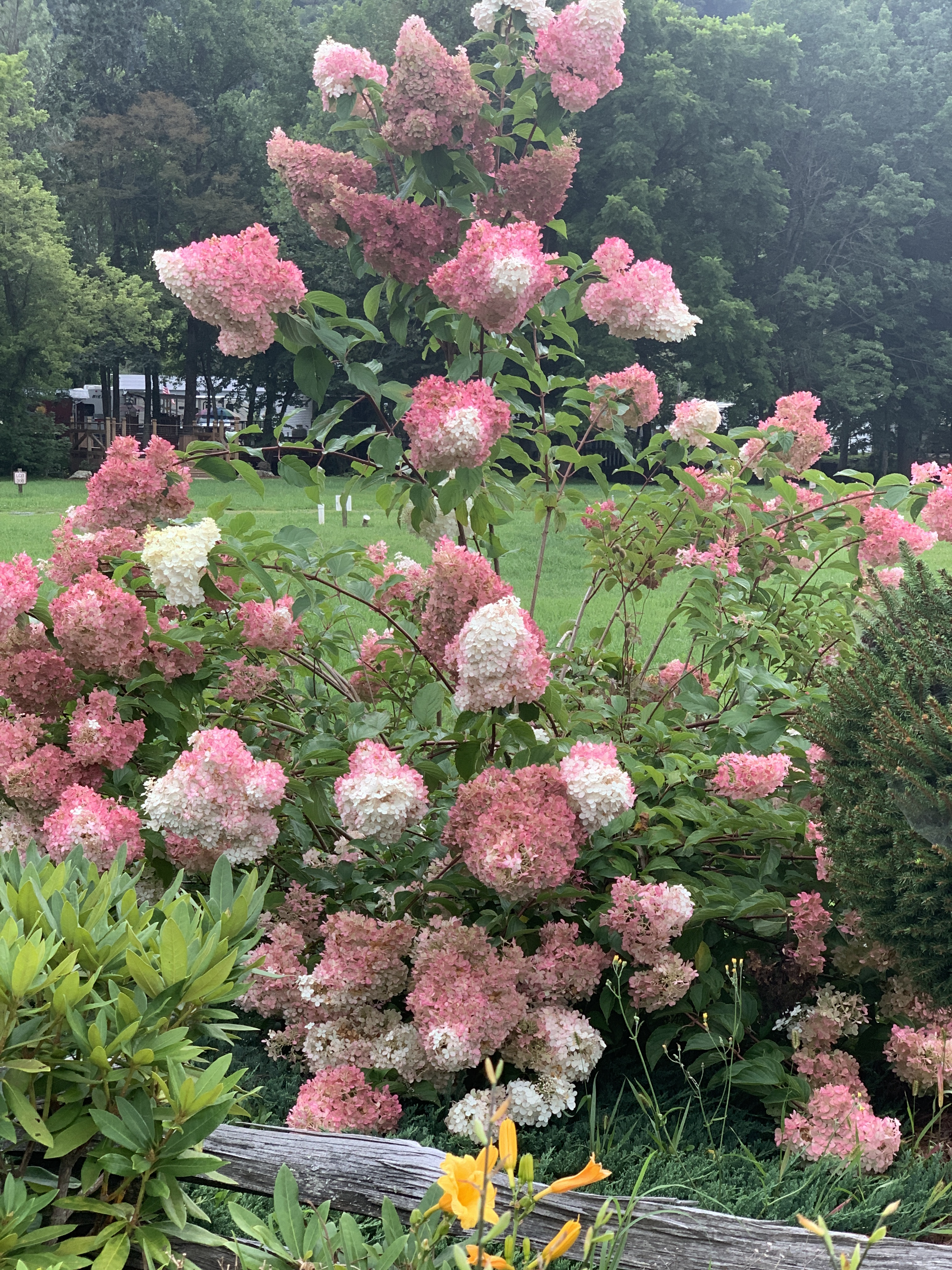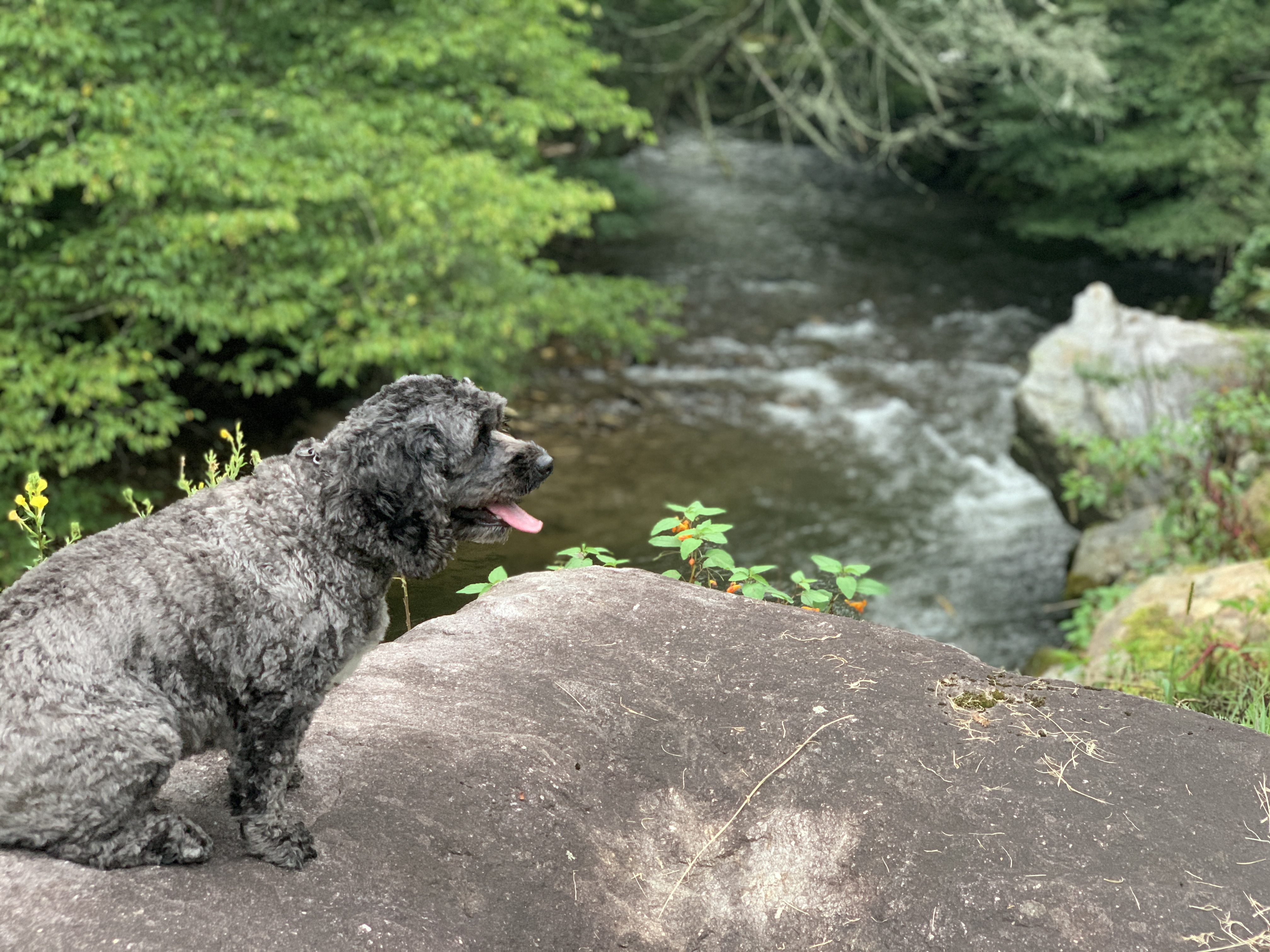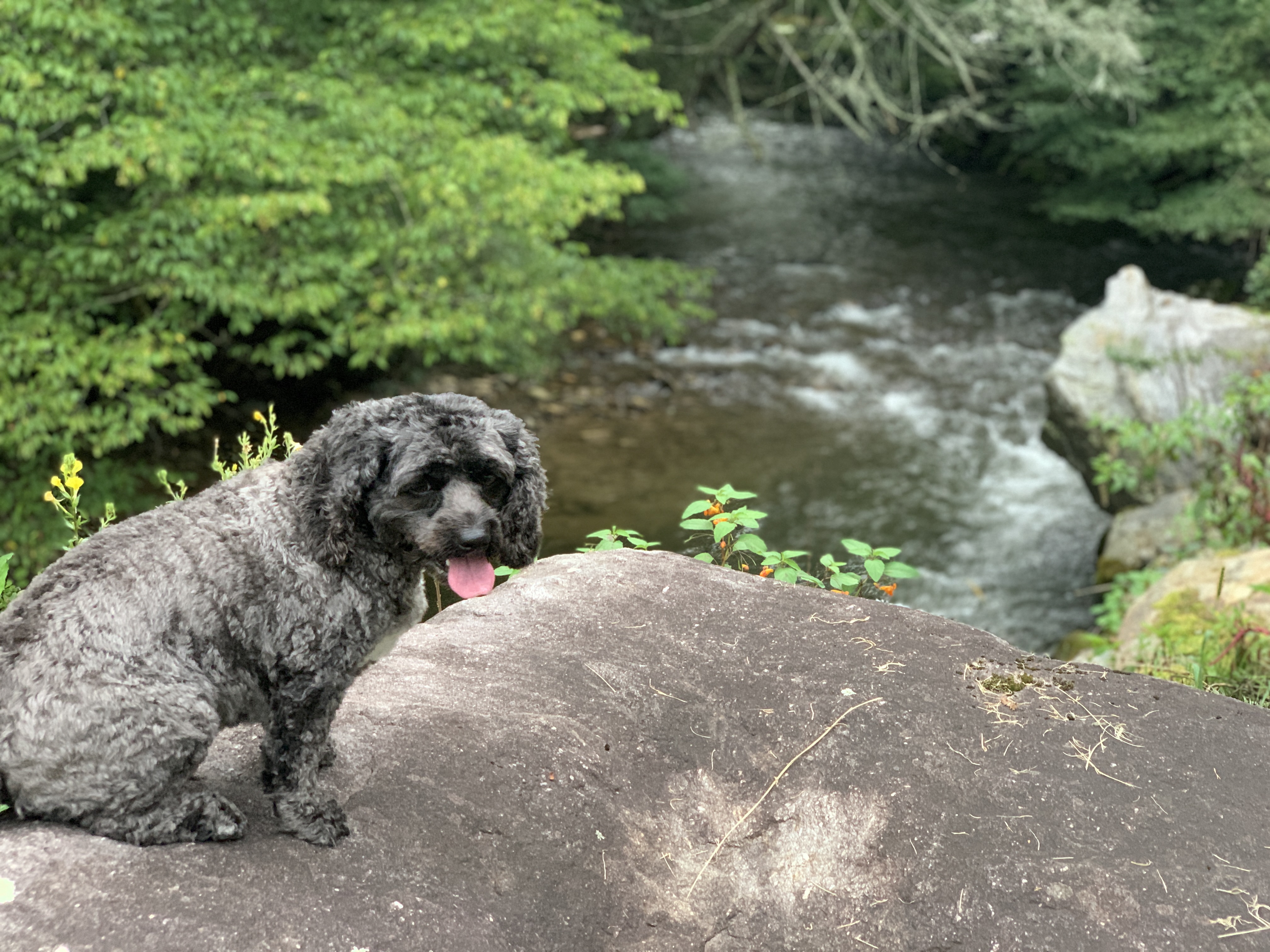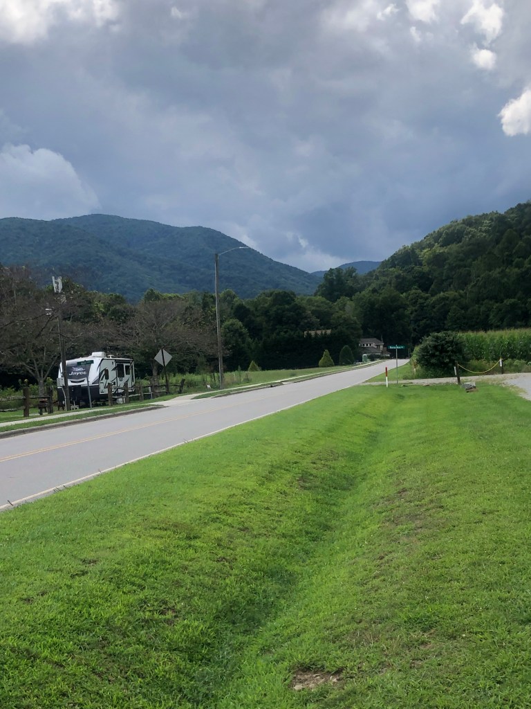 After we took a day trip to Asheville, Jeff took a ride up the Blue Ridge Parkway on the bike. Tonight we took a 4 mile walk and saw these beautiful strawberry hydrangeas. We also included some pictures from Scooter’s photo shoot on the walk. There’s a beautiful creek that runs right beside the sidewalk on Moody Farm Road. Our campground is on Moody Farm Road and I have shared two pictures at the bottom.