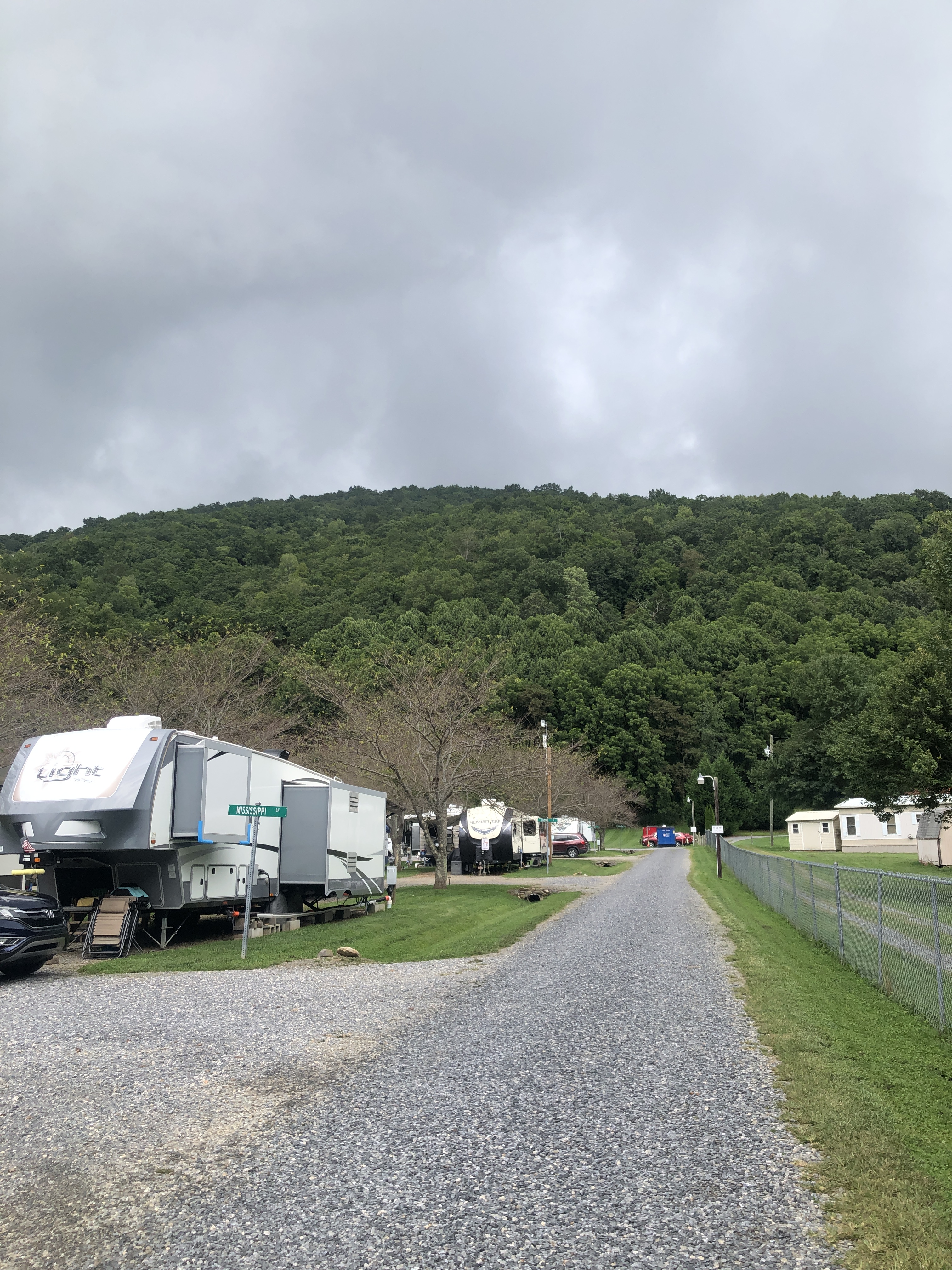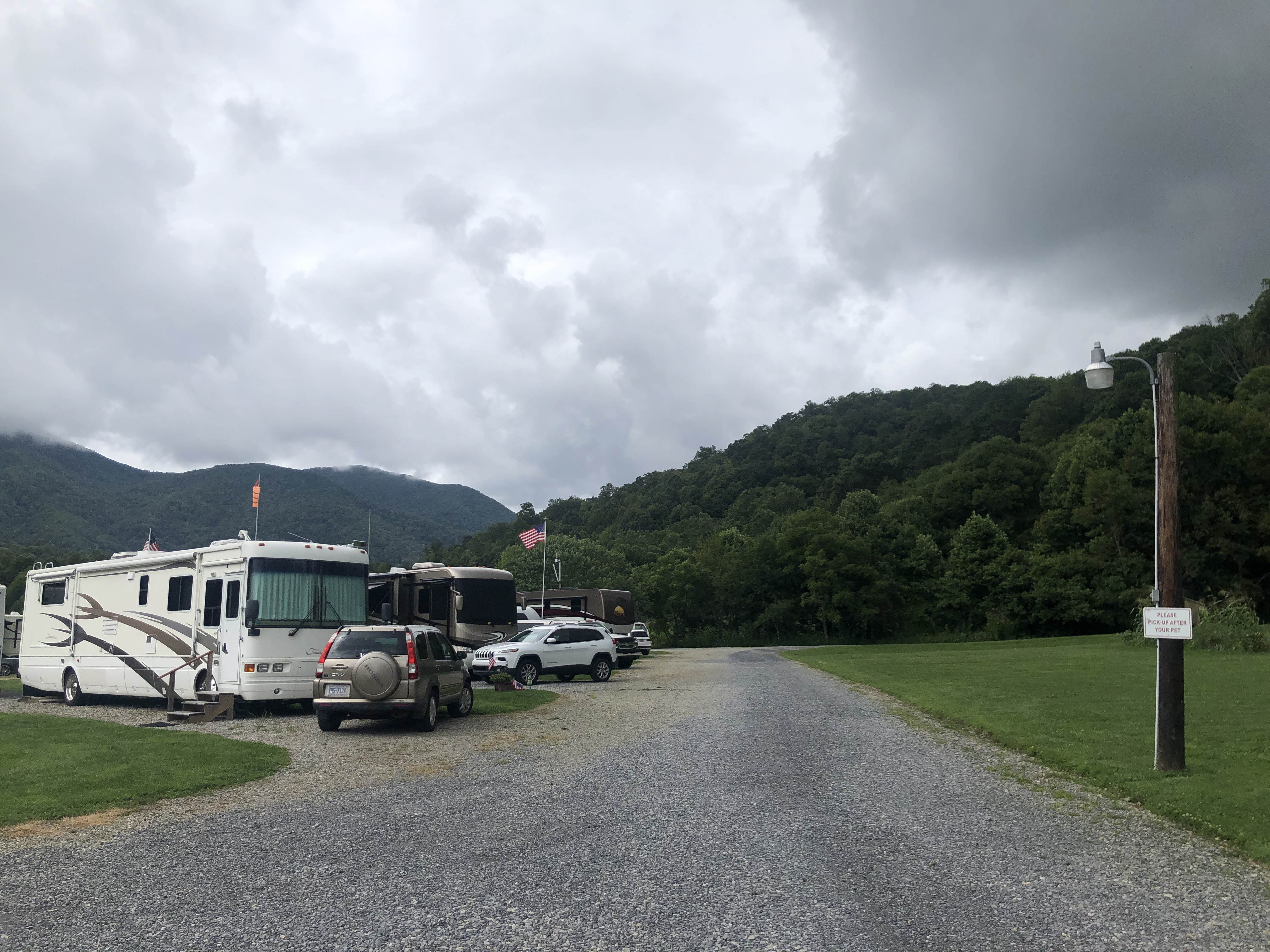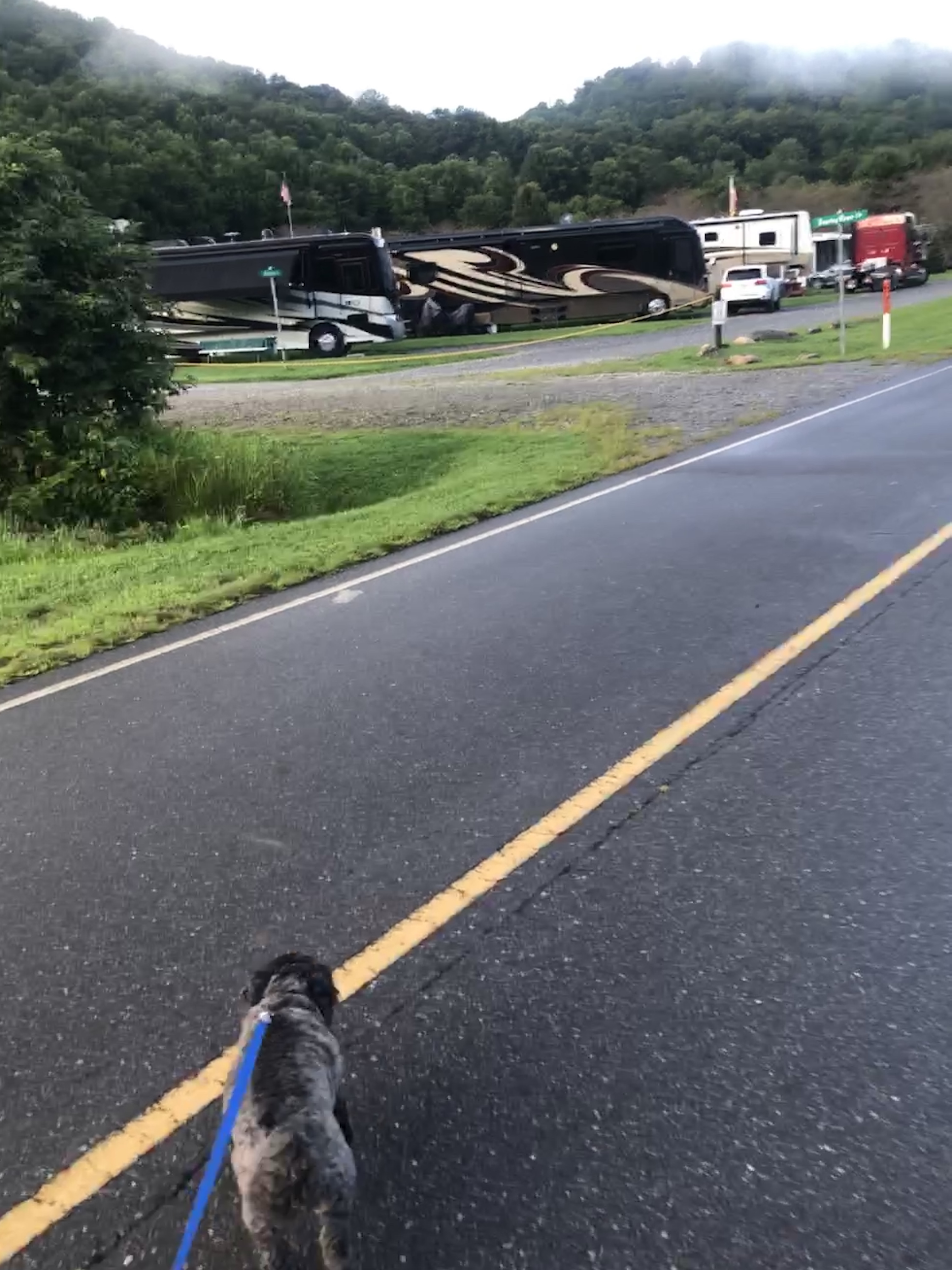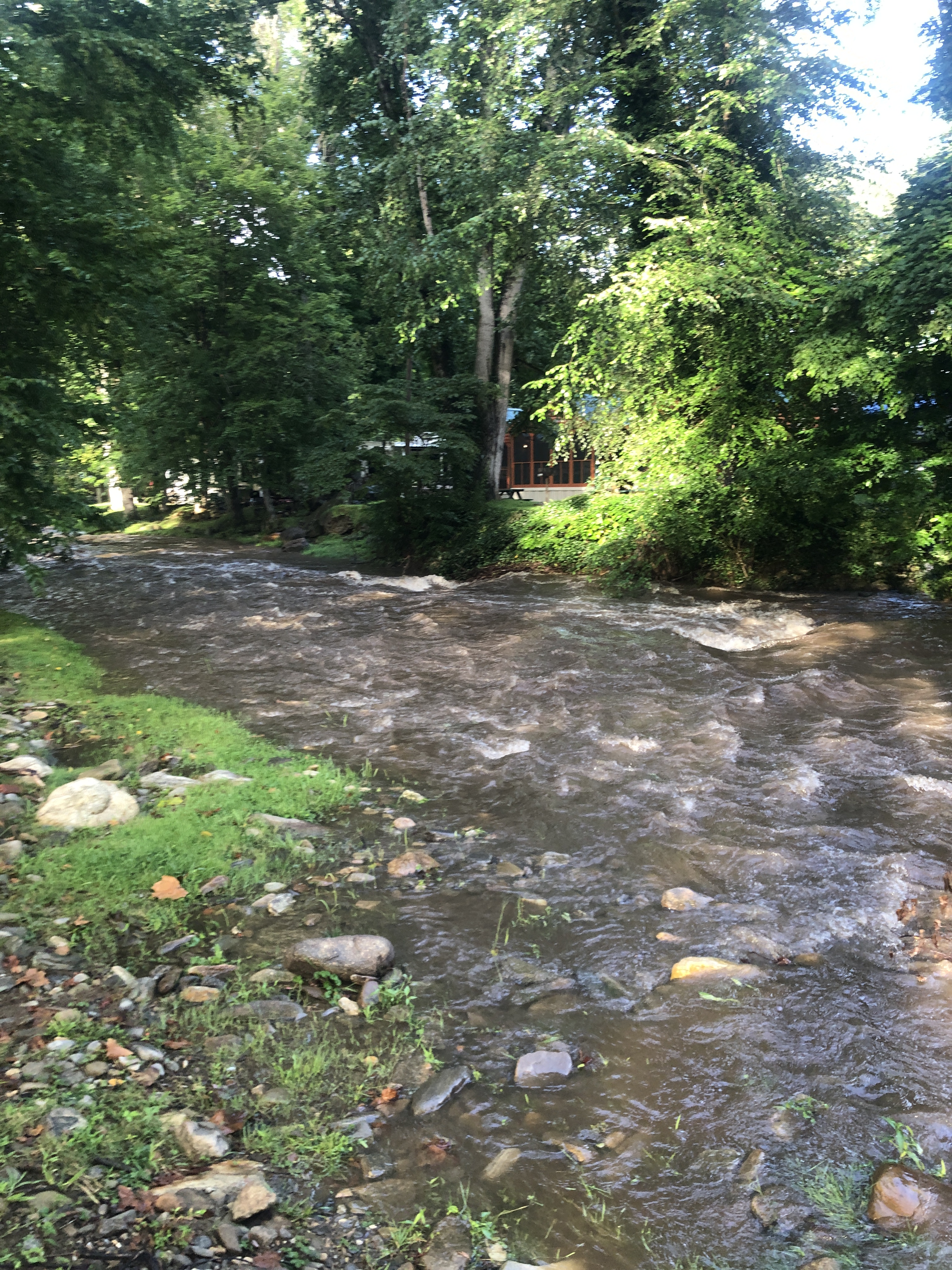 A walk around Cross Creek RV Park. We are in a beautiful valley here and Jonathan Creek also runs right beside the RV park. There’s a creek across the street. The pictures below show it right after a massive rain, however it’s usually clear and Scooter loves to run around in it.