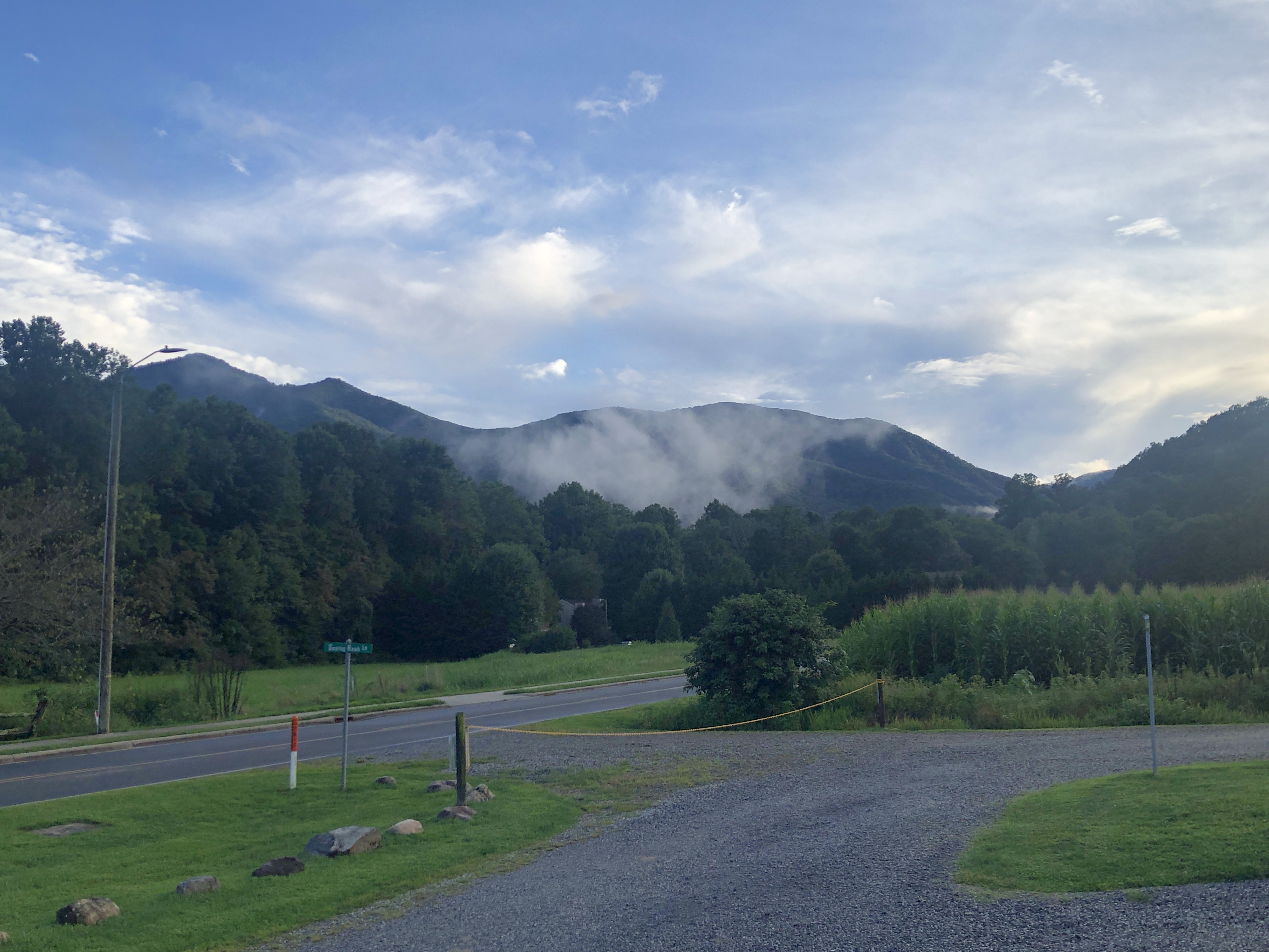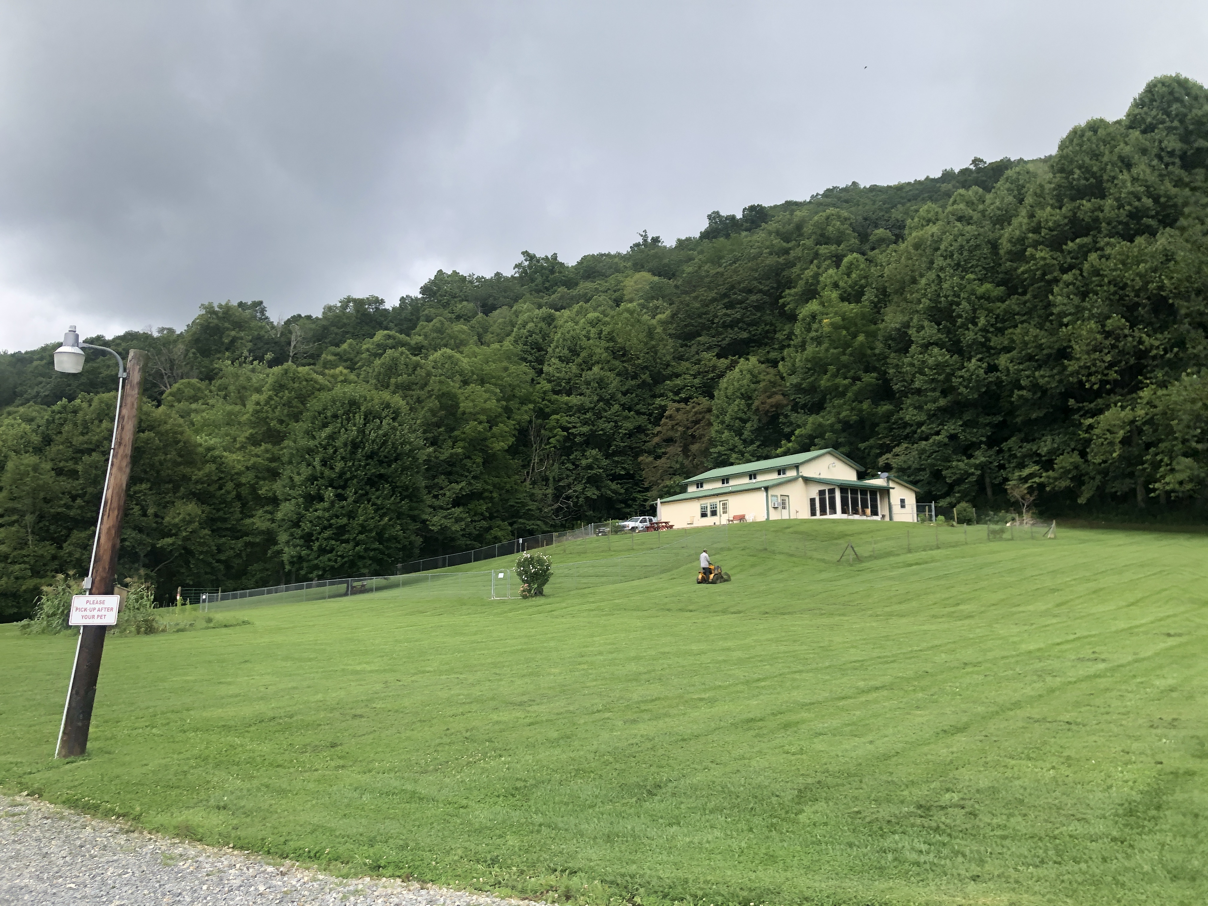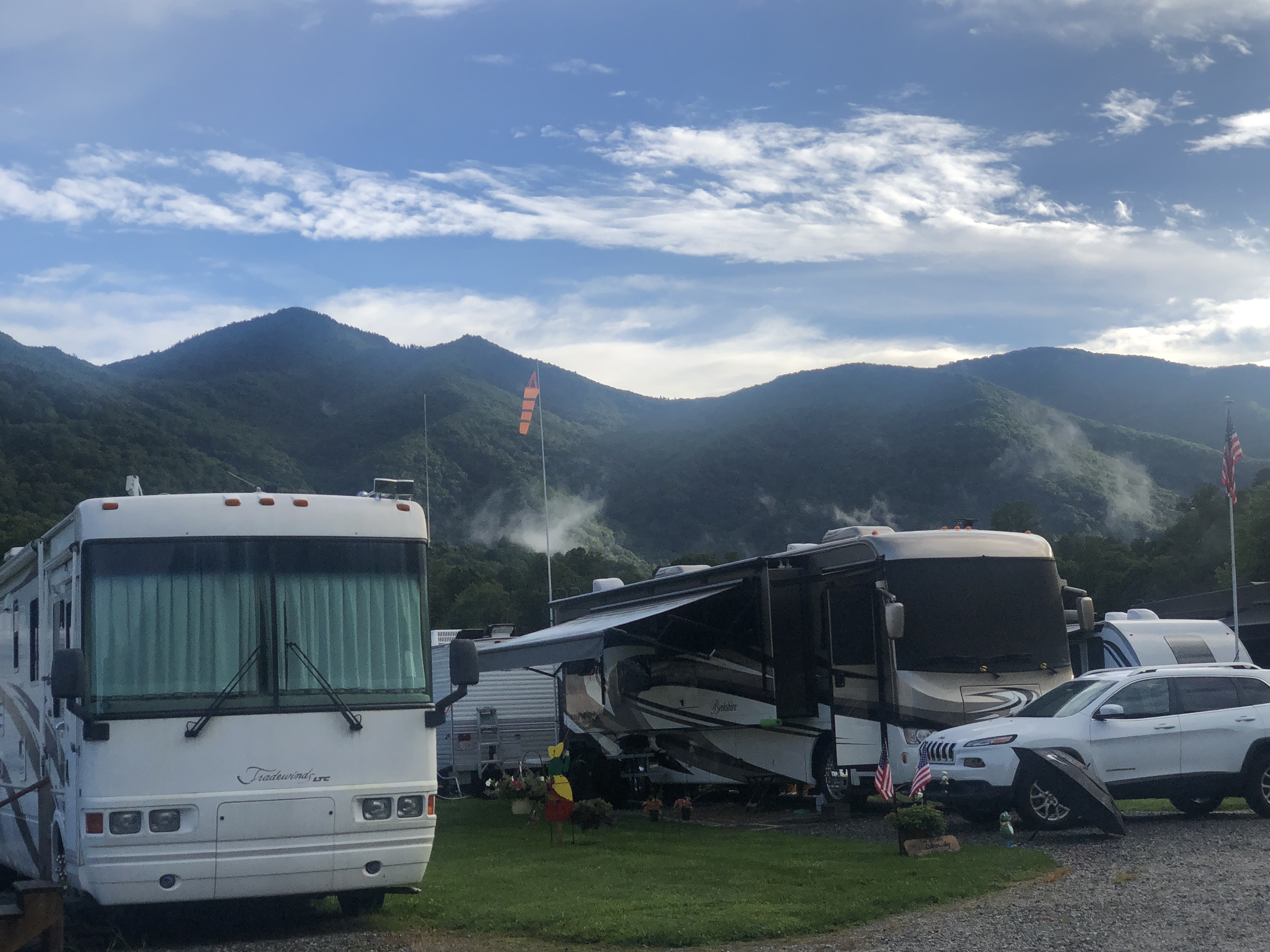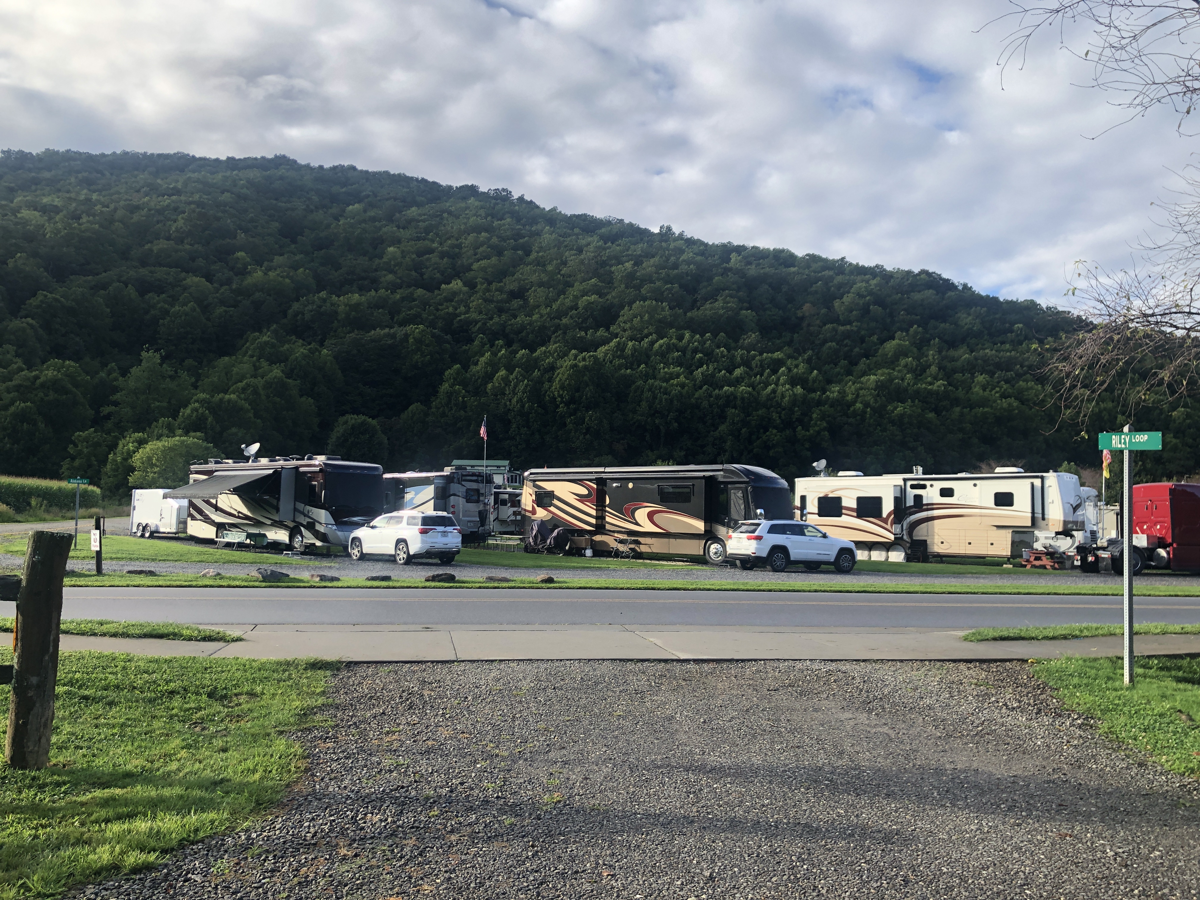 A walk around Cross Creek RV Park. We are in a beautiful valley here and Jonathan Creek also runs right beside the RV park. There’s a creek across the street. The pictures below show it right after a massive rain, however it’s usually clear and Scooter loves to run around in it.